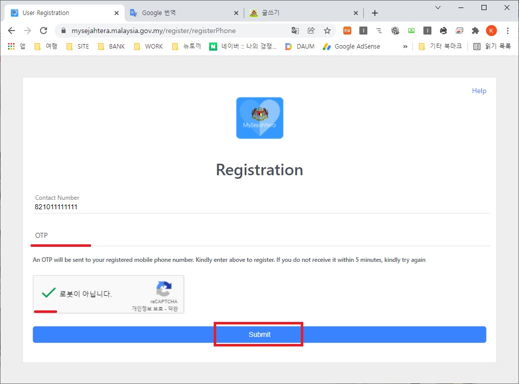OPT위치에는 본인 핸드폰으로 전송된 Code숫자 6자리를 입력하시면 됩니다.