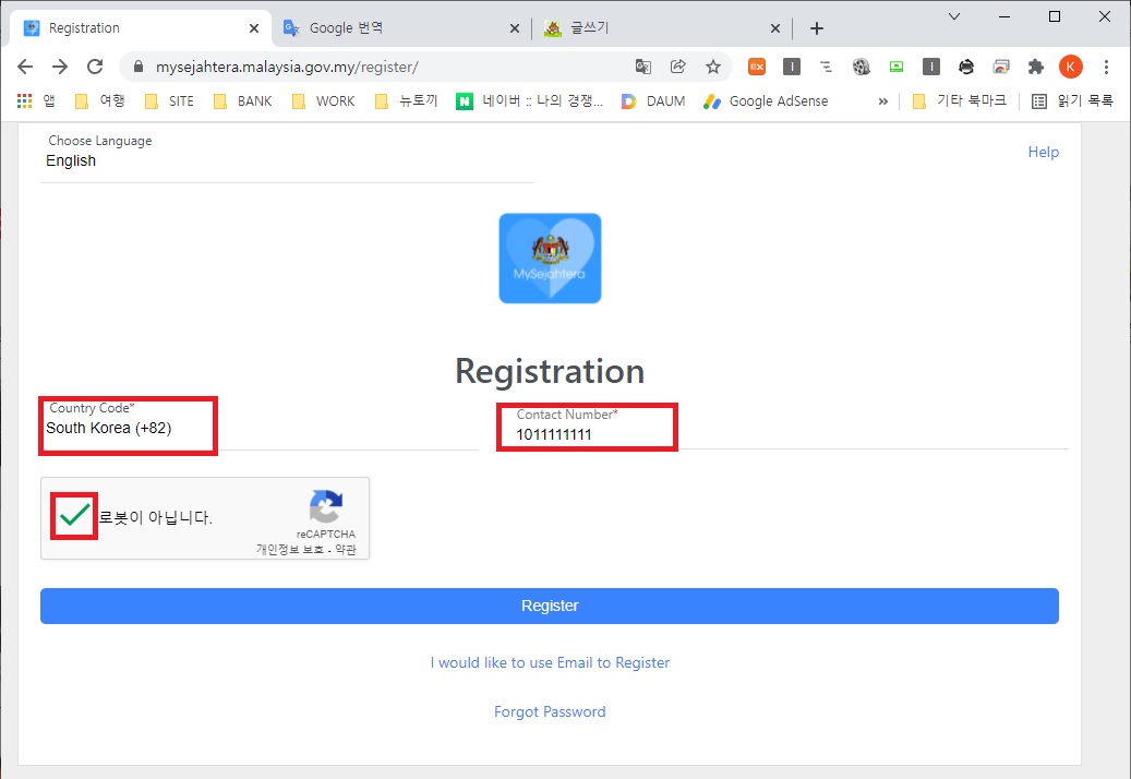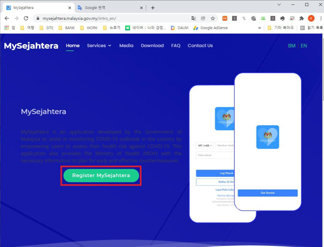 적색 사각형 부분의 Register MySejahtera 를 클릭 하여 다음 페이지로 이동합니다.