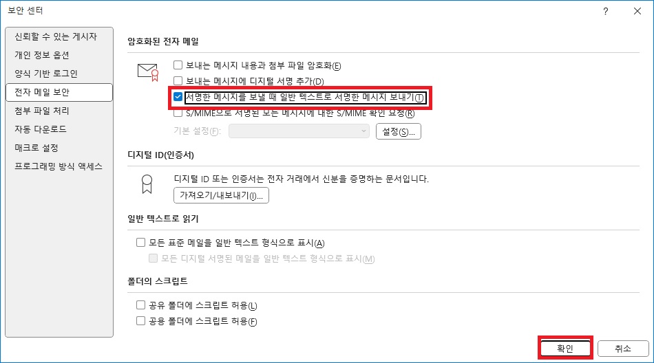 위의 내용 처럼 서명한 메시지를 보낼 때 일반 텍스트로 서명한 메시지 보내기를 선택하고 확인을 누르시면,