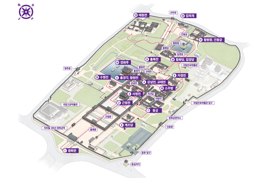 경복궁 관람코의 전체 모습은 위의 내용과 같으며 각 건물에 대한 설명은 아래 연결된 경로 이용하시면 됩니다.