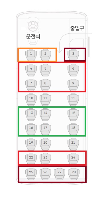 27번의 경우, 좌석 앞이 막아주는 부분 없이 통로이기에 버스 급정거시 다른 좌석보다 위험할 수 있습니다