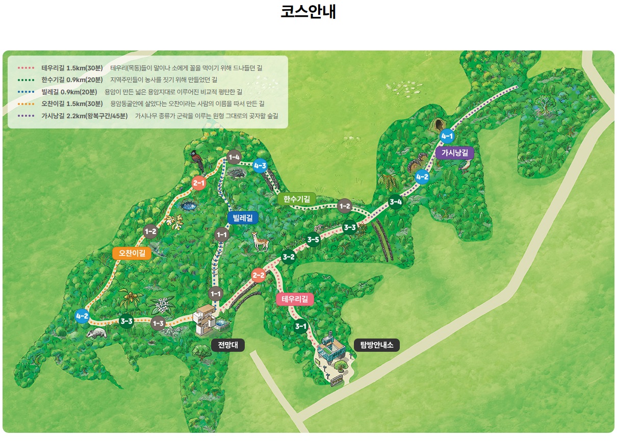 5코스: 탐방 안내소- 테우리 길- 가시낭 길- 한수기 길- 오찬이 길- 전망대- 테우리 길- 탐방안내소