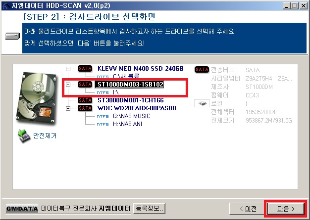 이번에는 검사하려고 하는 하드드라이브를 선택하는 화면 입니다.