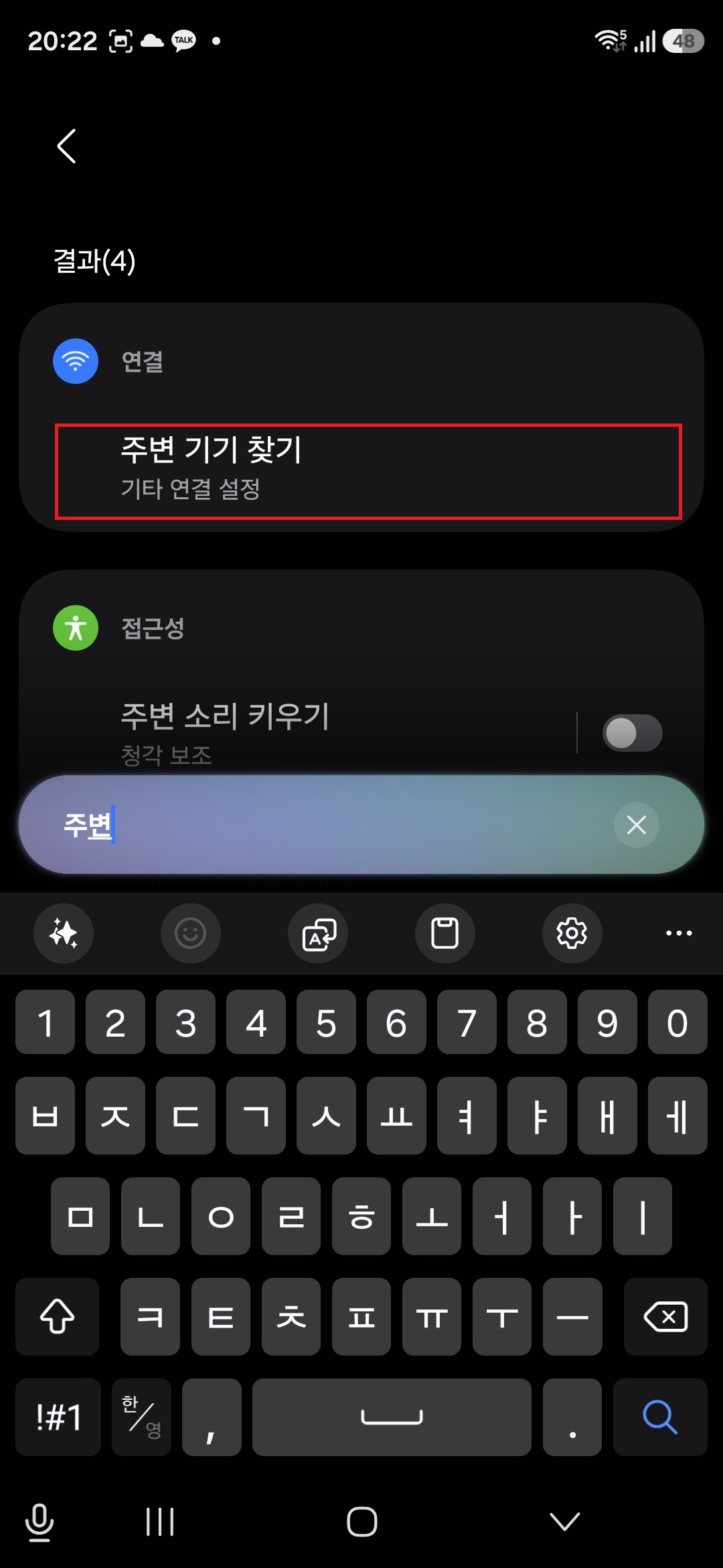 4. 입력 후 바로 나오는 결과 내용 중 '주변 기기 찾기' 라는 항목을 클릭합니다.