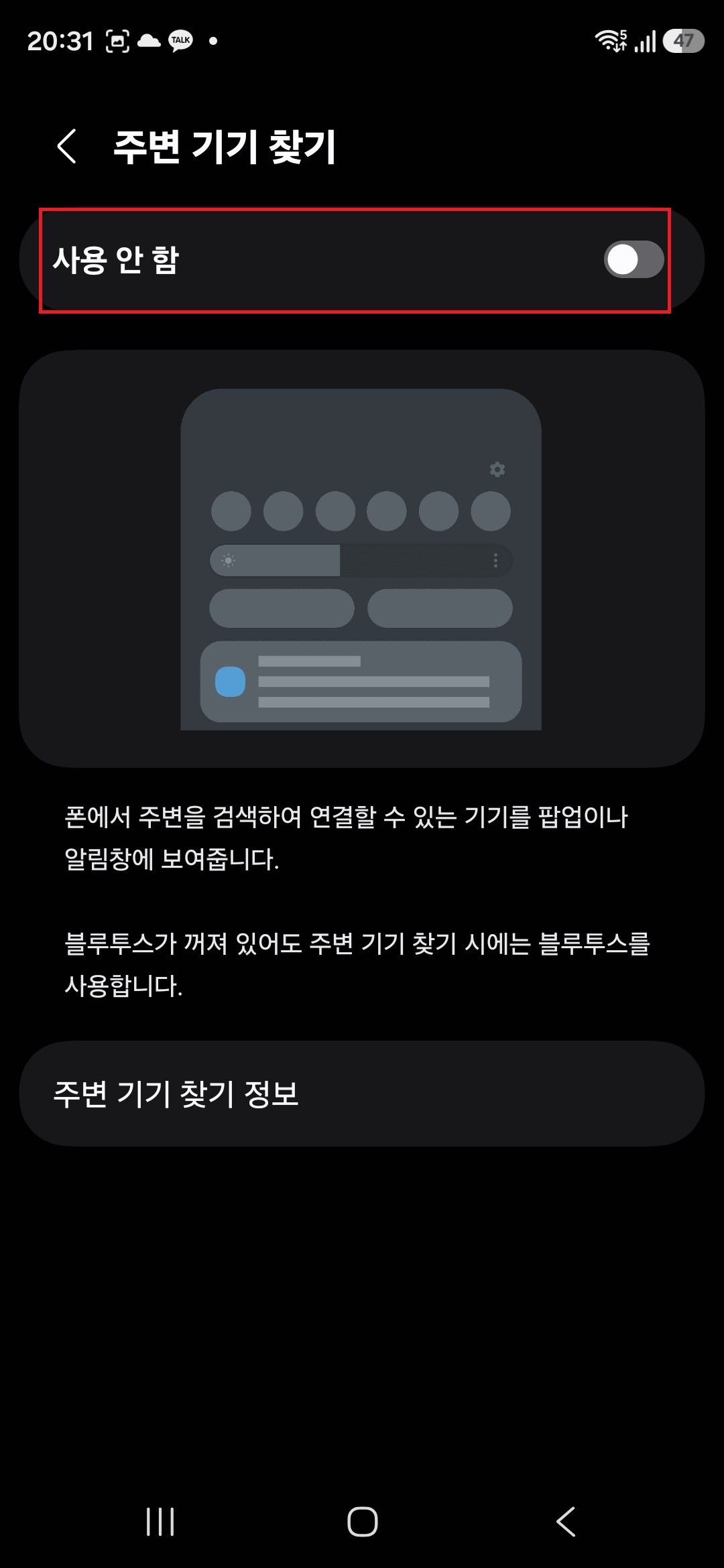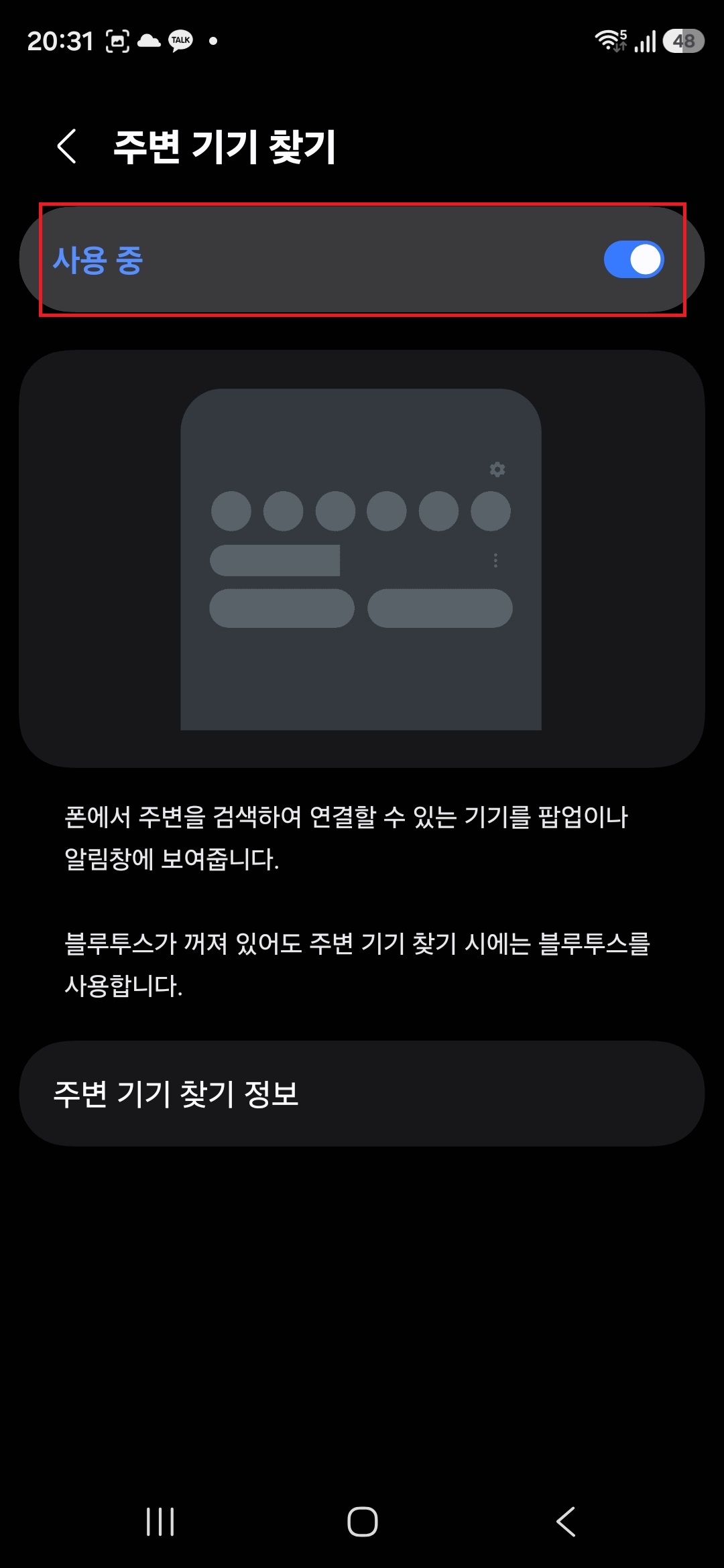 5. 현재 활성화 되어 있는 '주변 기기 찾기' 항목을 보게 되면,